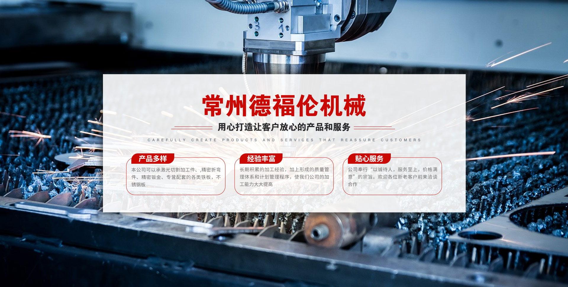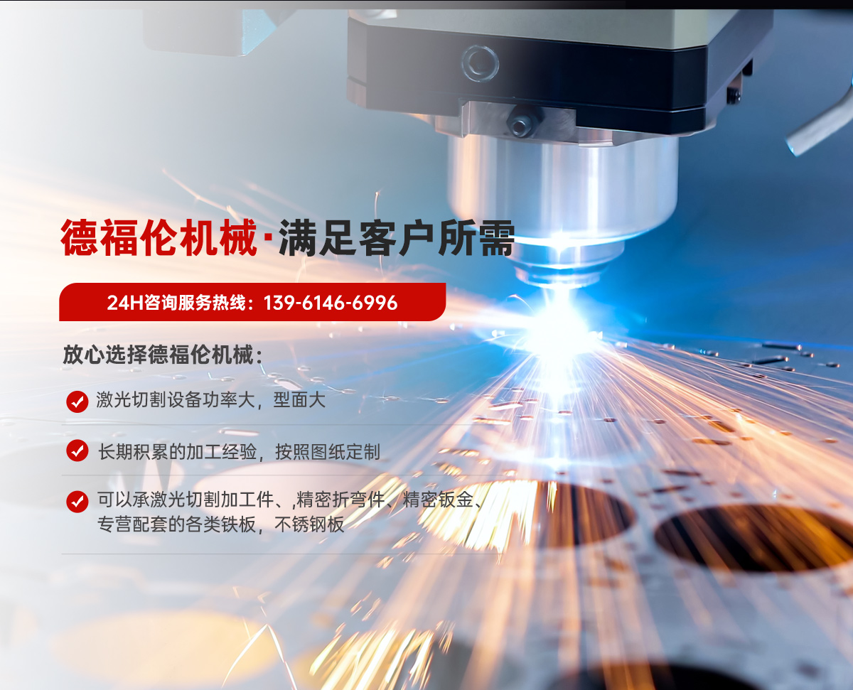 常州德福倫機械有限公司成立于2014年12月19號,位于江蘇省常州市武進區遙觀鎮建農村劍童路56號西門;公司配備;1萬瓦通K激光切割機1臺,6千瓦領C激光切割機1臺;機器行程6米*2.2米,切割不銹鋼50mm,碳鋼30mm;300噸大型數控折彎機。精密焊接機器數臺。本公司可以承激光切割加工件、,精密折彎件、精密鈑金、專營配套的各類鐵板,不銹鋼板。長期積累的加工經驗,加上形成的質量管理體系和計劃管理程序,使我們公司的加工能力大大提高,滿足客戶所需,是我們公司的目標!公司奉行“以誠待人,服務為上,價格滿意”的宗旨。歡迎各位領導;老總前來洽談合作!